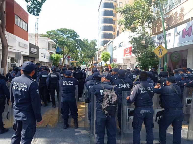 Ante las agresiones que realizan los estudiantes, decenas de elementos policíacos fueron desplegados en el primer cuadro de la ciudad