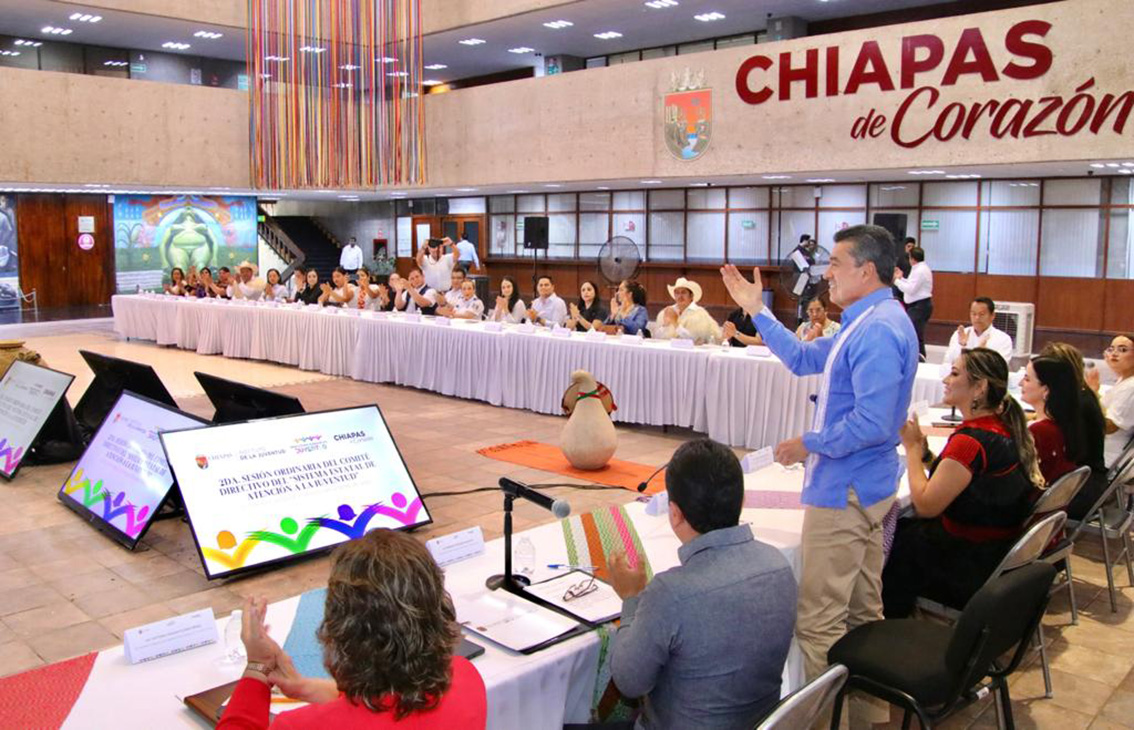 En la Segunda Sesión Ordinaria del Sistema Estatal de Atención a la Juventud, el gobernador Rutilio Escandón Cadenas convocó a todas las instituciones estatales a seguir sumando esfuerzos y recursos, con el objetivo de brindar las herramientas necesarias y abrir nuevos caminos para consolidar el quehacer productivo y la participación de la juventud chiapaneca en los ámbitos social, político, económico y cultural.