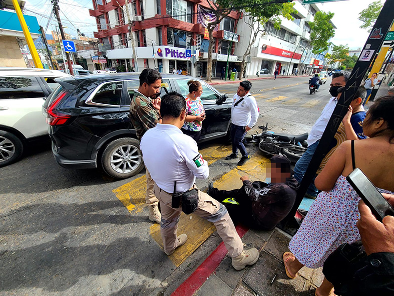 Dos automóviles protagonizaron un aparatoso accidente de tránsito la mañana de este miércoles sobre la avenida central y esquina de la 5 poniente de la zona centro de Tuxtla Gutiérrez. Una de las unidades implicadas fue una camioneta tipo Suv marca Honda tipo CRV de color negra y una motocicleta marca italika de color negro con azul 150 cc. Agentes de tránsito y vialidad municipal quienes tomaron conocimiento del percance mencionaron que los vehículos circulaban en el sentido de poniente a oriente cuando pasó el choque. Al parecer la colisión ocurrió cuando la camioneta giró a su derecha, lo que le hizo le cerrara el paso al motorista que no pudo frenar y terminó chocando en la parte frontal. Derivado del impacto el tripulante del caballo de acero resultó con heridas en la pierna izquierda, pero no requirió ser valorado por alguna institución médica. Después de un diálogo entre los conductores, ambos llegaron a un acuerdo para el pago de los daños, después de la firma de desistimiento se liberó la vía.