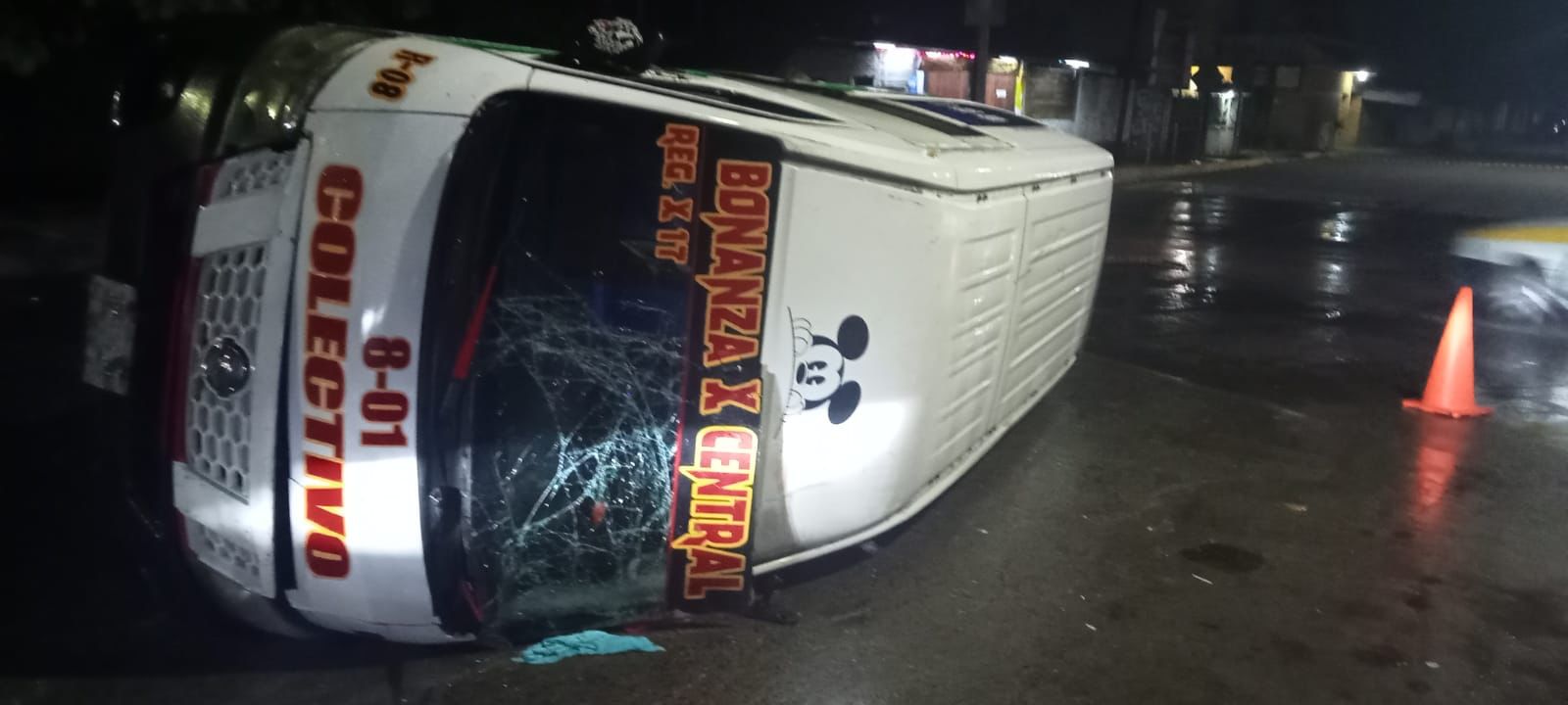 Tapachula. Chiapas. Un colectivo de la ruta Bonanza – Centro y un vehículo con placas particulares chocaron sobre la 10ª avenida Sur, 24 calle Poniente, ocasionando que una de las unidades terminara volcada.