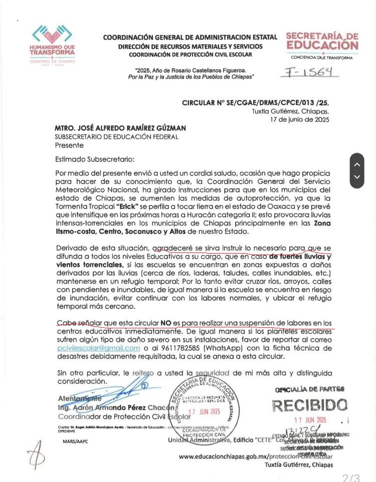 La Secretaría de Educación de Chiapas emitió una circular dirigida a todos los niveles educativos para reforzar medidas de autoprotección ante la presencia de la tormenta tropical “Erick”, la cual podría intensificarse en las próximas horas a huracán categoría II, generando lluvias torrenciales y fuertes vientos en las regiones Istmo-Costa, Centro, Soconusco y Altos.