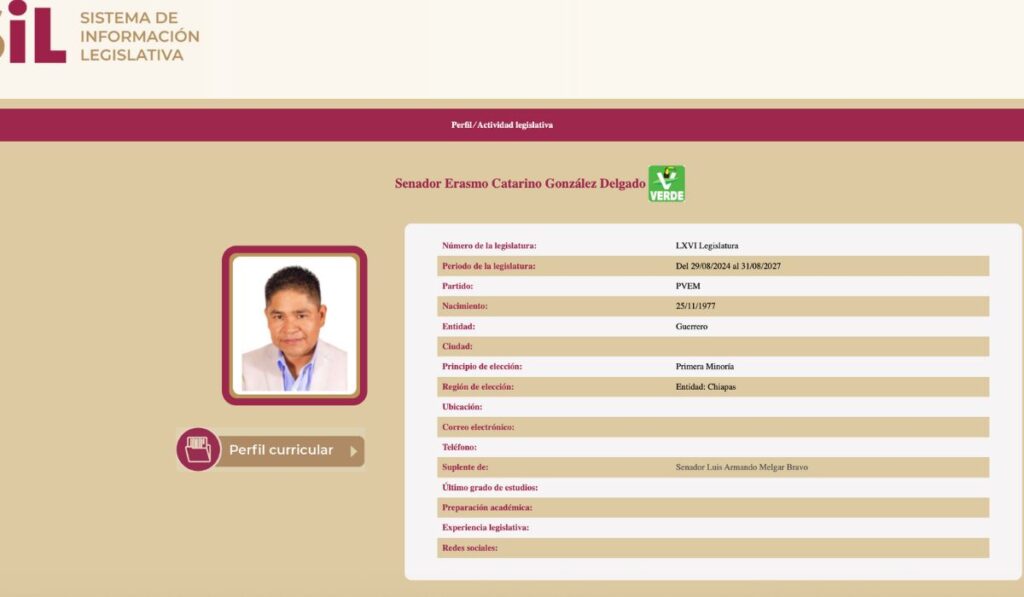 El cantante Erasmo Catarino González Delgado rindió protesta como senador de la República en representación del estado de Chiapas, luego de que el Pleno del Senado aprobara una licencia temporal a su titular, Luis Armando Melgar Bravo, del Partido Verde Ecologista de México (PVEM).