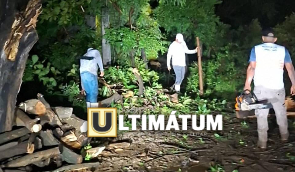 Equipados con motosierras y machetes, los trabajadores realizaron desramado y retiro de árboles caídos, especialmente en carreteras donde aún esta mañana de lunes permanecen obstrucciones parciales.