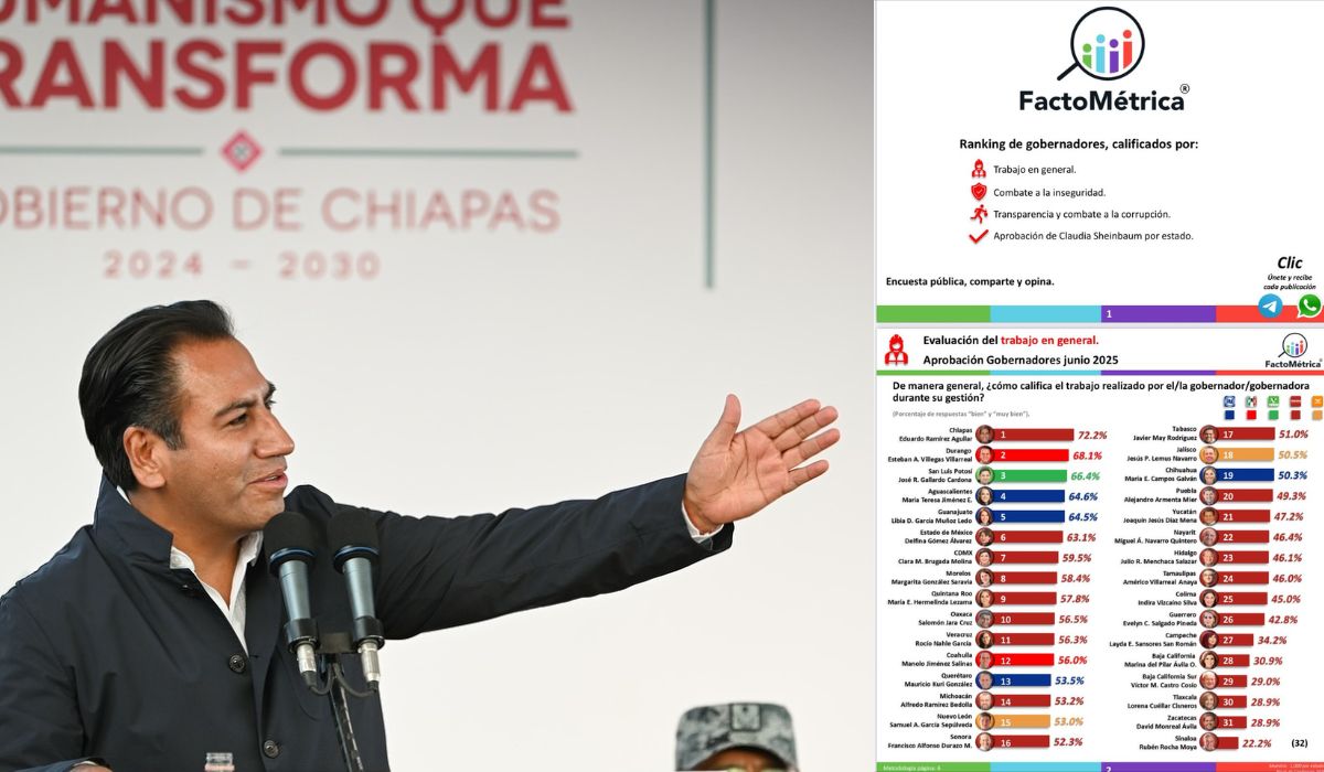 Chiapas alcanzó el primer lugar nacional en aprobación ciudadana al trabajo de su gobernador, Eduardo Ramírez Aguilar, de acuerdo con la más reciente encuesta de la casa FactoMétrica correspondiente a junio de 2025. El mandatario obtuvo una calificación de 72.2 por ciento en desempeño general, superando a los 31 gobernadores restantes.