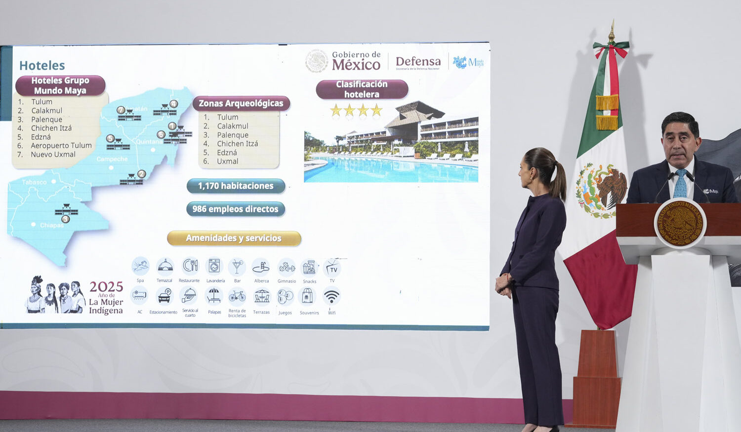 Por su parte, Adolfo Héctor Tonatiuh Velasco Bernal, titular de Grupo Mundo Maya, señaló que los siete hoteles a cargo de la Sedena —ubicados en Tulum, Calakmul, Palenque, Chichen Itzá, Edzná, Aeropuerto Tulum y Nuevo Uxmal— son de categoría cuatro estrellas y han generado 986 empleos directos. Los parques han recibido 8.6 millones de visitantes y los paquetes incluyen vuelo, hospedaje, alimentos, actividades y transporte.