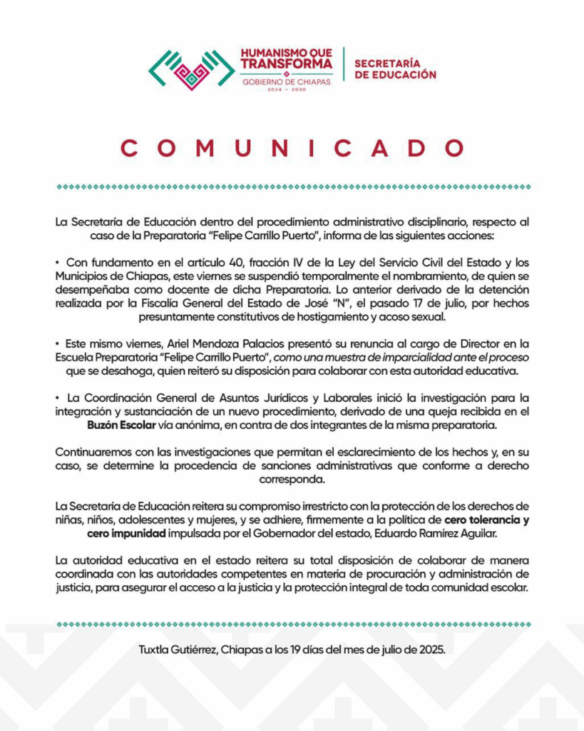La Secretaría de Educación del Estado de Chiapas suspendió temporalmente a un docente de la Preparatoria “Felipe Carrillo Puerto”, tras su detención por parte de la Fiscalía General del Estado el pasado 17 de julio, por presuntos actos de hostigamiento y acoso sexual.