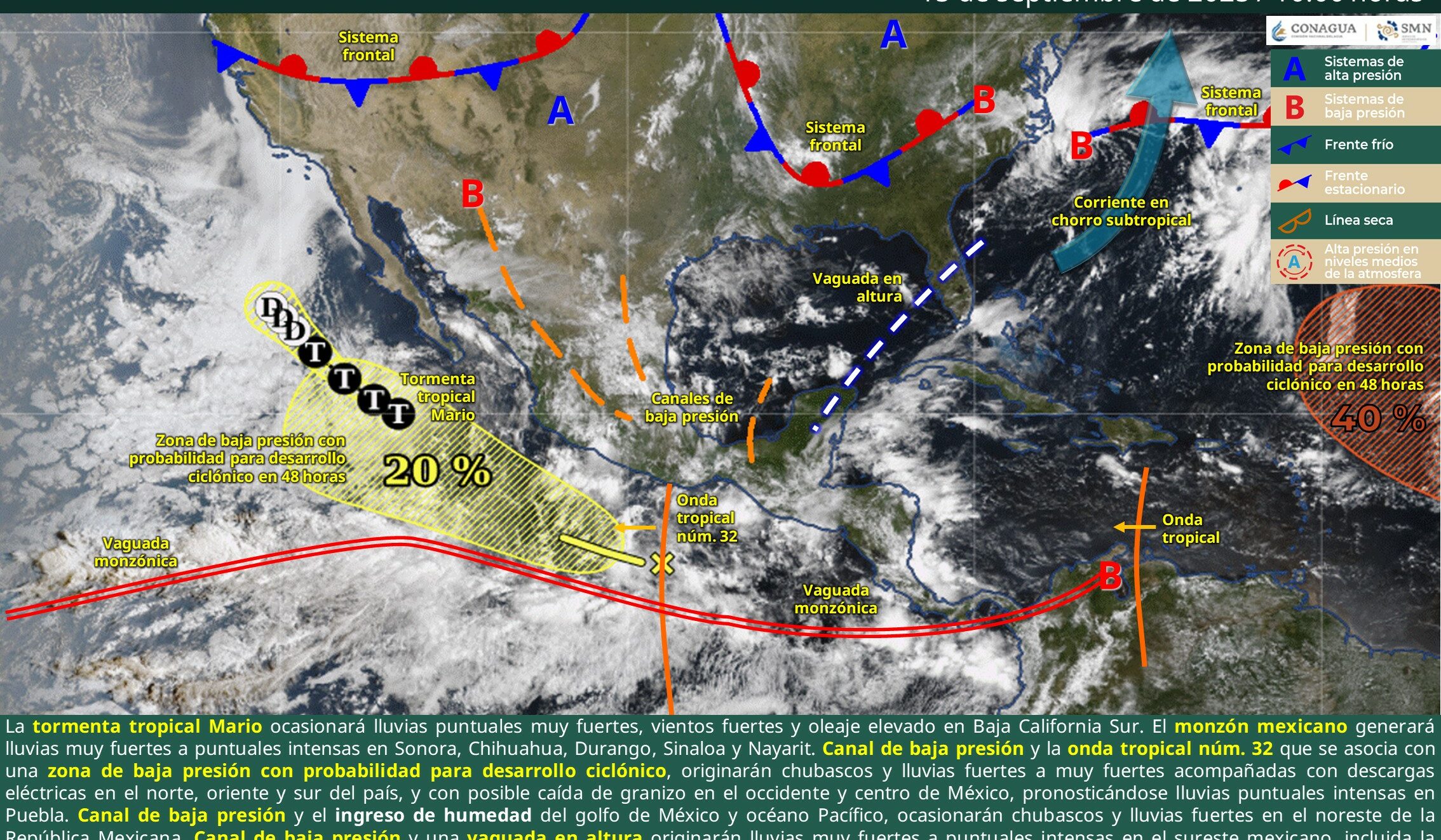 De miércoles a viernes, los remanentes de Mario interactuarán con una vaguada en altura, mientras una baja presión al sur de Michoacán podría evolucionar a ciclón tropical, generando lluvias de fuertes a intensas, vientos y oleaje elevado en el Pacífico central y sur.