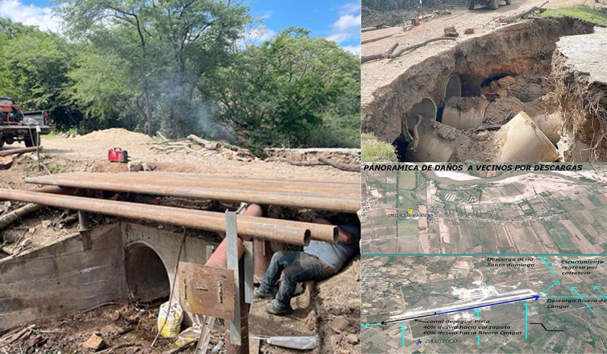 Cervantes explicó que el canal perimetral “indujo” siete escurrimientos naturales a un solo cauce, lo que multiplicó volúmenes y velocidades y terminó por socavar los caminos rurales. Recordó que, en un primer momento, la autoridad operadora del aeropuerto atendió tramos contiguos a la terminal con soluciones mayores a las de alcantarillado (claro mayor y elevación de terraplén). Sin embargo, “aguas abajo” —donde se ubican los predios de su microrregión— persistieron los arrastres y la pérdida del revestimiento de rodamiento. Uno de los puntos críticos terminó con un socavón cuya luz, calcularon, rebasó los 30 metros, lo que hizo inviable el tránsito de vehículos ligeros y cualquier equipo de emergencia.
