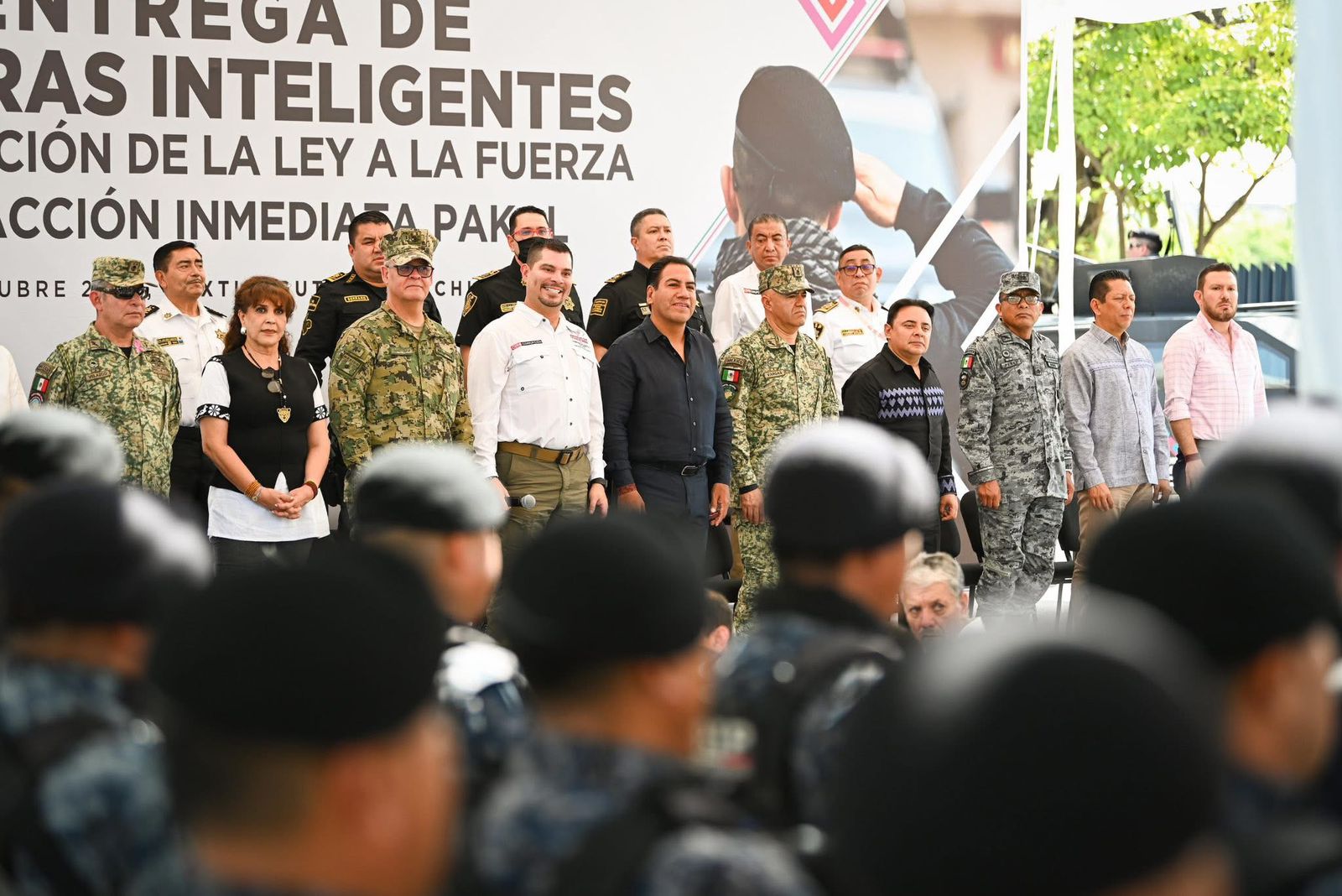 Durante la entrega de cámaras inteligentes y vehículos blindados a la Fuerza de Reacción Inmediata Pakal (FRIP), el gobernador Eduardo Ramírez Aguilar destacó que la seguridad era una de las principales prioridades del gobierno de la Nueva ERA. Por ello, se realizó una importante inversión en equipamiento, unidades terrestres y aéreas, herramientas tecnológicas e inteligencia operativa, con el objetivo de contar con una policía preparada y profesional al servicio del pueblo de Chiapas.