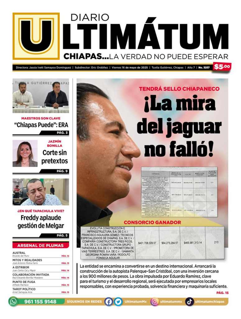 En Chiapas, donde en el pasado lo que anunciaba no se cumplía y lo que se prometía se olvidaba, hay que reconocer cuando sucede lo contrario. Y hoy, sucede. El primer tramo de la carretera Palenque-Ocosingo, de 5 kilómetros, está prácticamente listo con el tendido de asfaltos. El consorcio chiapaneco que asumió el reto no solo avanza con paso firme -85% de ejecución-, sino que entregará en enero el primer tramo de una obra estratégica para Chiapas, reconocida por el gobernador Eduardo Ramírez Aguilar como La Ruta de las Culturas Mayas. Importante subrayar que los constructores no son grandes trasnacionales ni empresas apadrinadas desde la Ciudad de México ni de otro lugar del país. Son chiapanecos, con nombre y apellido: José María Coello, de la empresa Evolutia; Francisco Aguilera, de FAG; Rafael Cancino, de Techisa; Eduardo Álvarez, de Grupo Tapachula; Javier Degives, de PVT y Roberto de la Cerda, de Tres Picos. Ellos, juntos, rompieron con la maldición del “no se puede” que tanto ha perseguido a la iniciativa privada local. Lejos de egos, protagonismos y pleitos intestinos, trabajaron con coordinación, compartieron responsabilidad y respondieron con hechos a la confianza del gobierno de la Nueva ERA. El beneficio no es menor porque la visión del gobernador Eduardo Ramírez Aguilar es que esta carretera sea clave para detonar la actividad económica, el turismo, el comercio interregional y el acceso a servicios en zonas históricamente marginadas. Y es que Palenque y Ocosingo no solo comparten riqueza cultural y biodiversidad, comparten también un enorme potencial de desarrollo, que por décadas fue truncado por la falta de infraestructura moderna. Con esta obra se abren oportunidades para miles de chiapanecos que dependen del tránsito seguro y rápido entre ambas regiones.