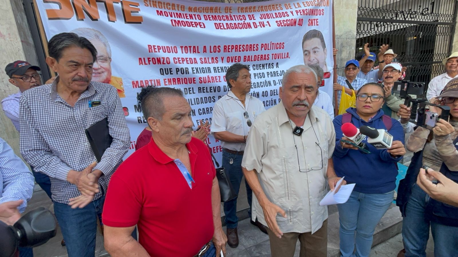 Jubilados y pensionados adscritos a la delegación D-IV-I de la Sección 40 del Sindicato Nacional de Trabajadores de la Educación (SNTE), se manifestaron ayer a las puertas del Congreso para denunciar presunto acoso, represión sindical y judicialización de la protesta, que atribuyen a Martín Suárez Culebro, secretario general de dicha delegación.