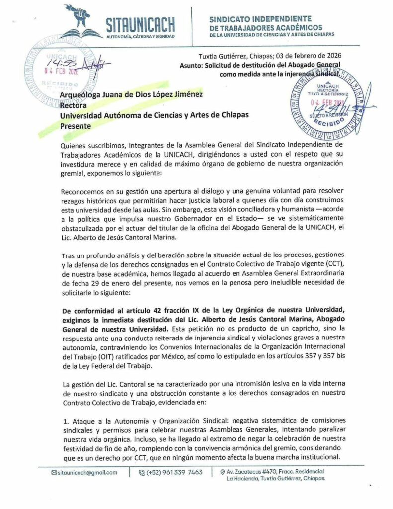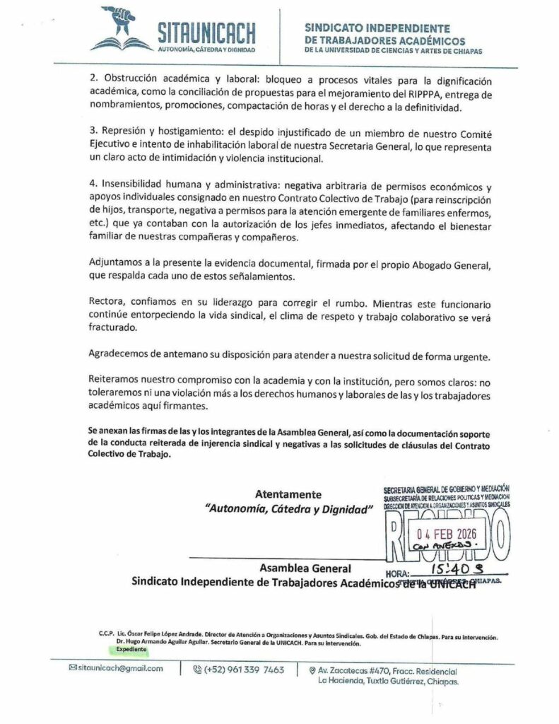 TGZ. Dirigentes del Sindicato Independiente de Trabajadores Académicos de la Universidad de Ciencias y Artes de Chiapas (SITAUNICACH) señalaron que, a un año de la actual administración universitaria, persisten incumplimientos en el contrato colectivo, rezagos laborales y condiciones deficientes que impactan directamente en la labor docente y la calidad educativa.