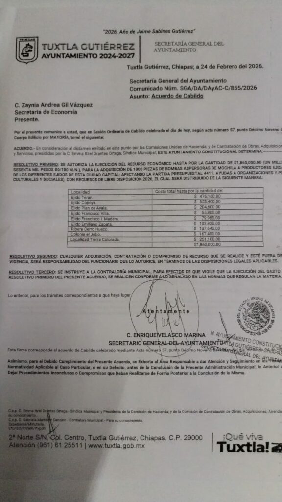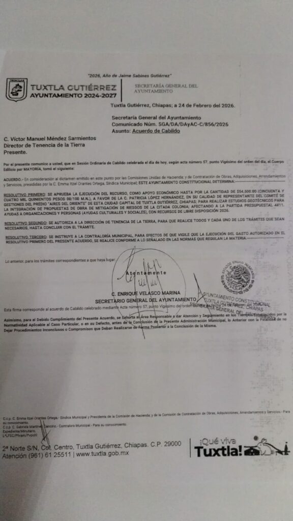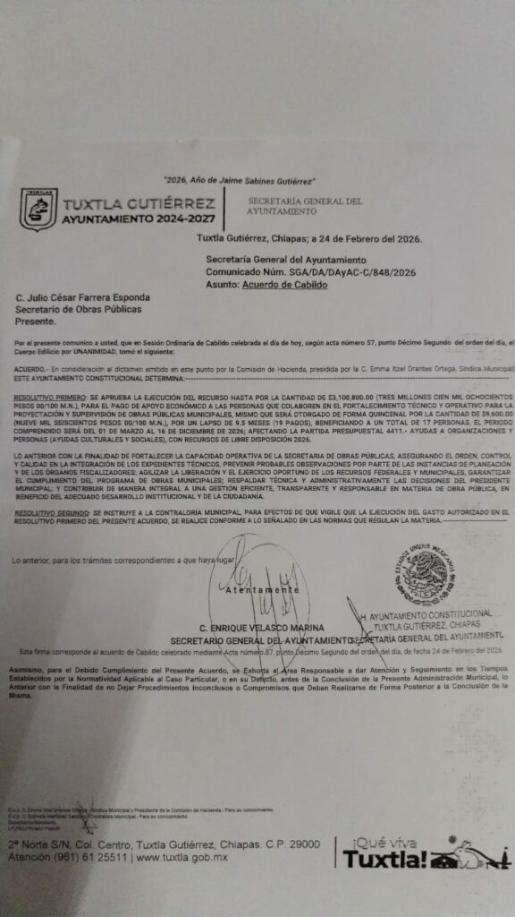El Cabildo del Ayuntamiento de Tuxtla Gutiérrez aprobó en sesión ordinaria diversos acuerdos para la ejecución de recursos públicos destinados a apoyos económicos, estudios técnicos y adquisición de equipamiento en distintos puntos de la capital chiapaneca.